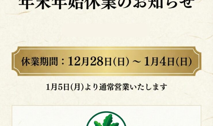 平素は格別のご高配を賜り、厚く御礼申し上げます。 誠に勝手ながら、弊社では下記期間を年末年始休業とさせていただきます。 【休業期間】 2025年12...